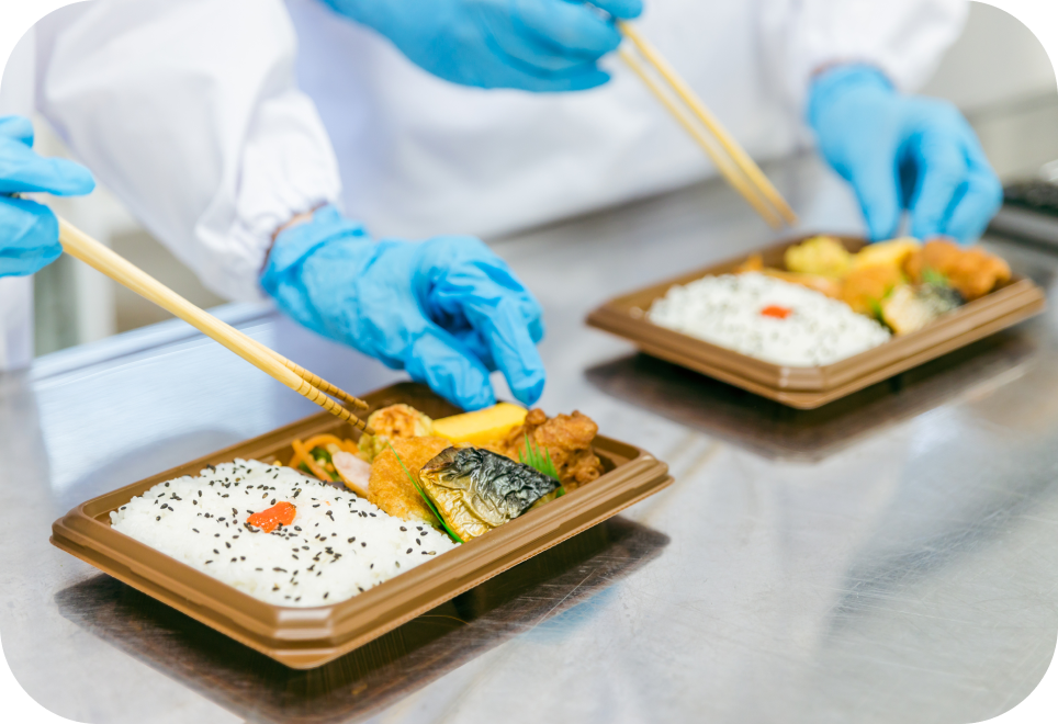 - お弁当箱に食材を適切な分量で盛り付ける作業。